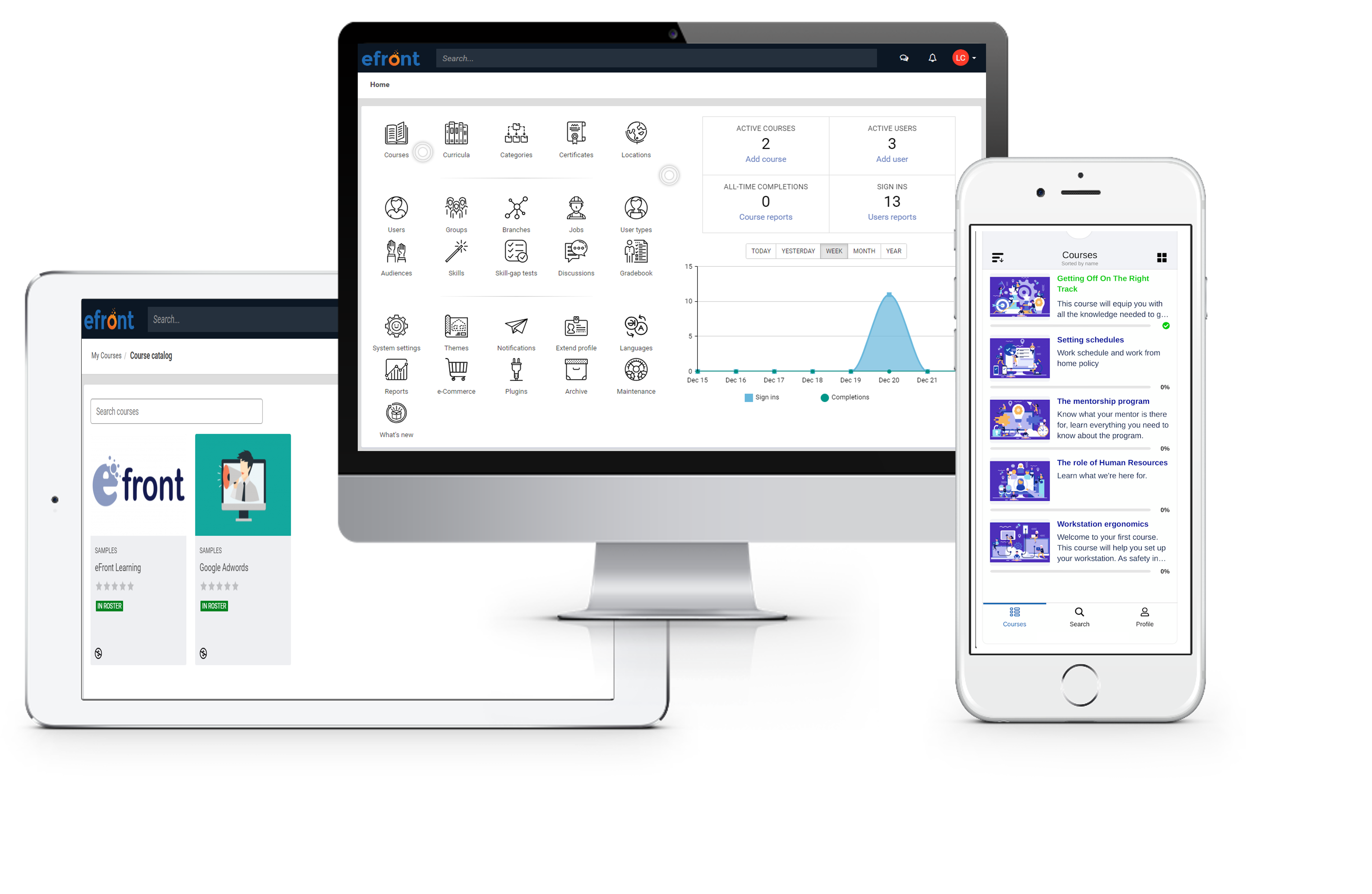 Om je medewerkers te blijven motiveren en training actief te houden binnen je organisatie, is toegankelijkheid essentieel. Met eFront kunnen medewerkers hun training volgen vanaf elk apparaat, op elk moment en op elke locatie.
